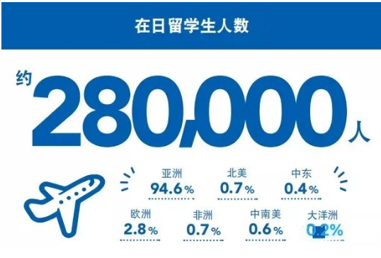 在日留學(xué)生人數(shù)約為28萬人,其中來自于亞洲的留學(xué)生占總數(shù)的94.6%左右。