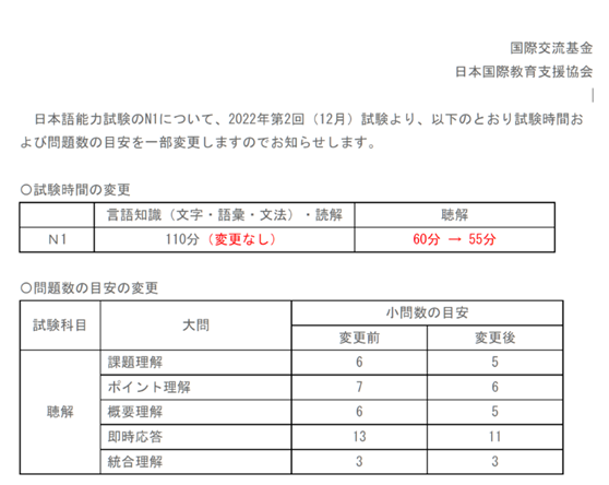 8月5日,日語(yǔ)能力考官網(wǎng)更新重要通知:自2022年12月的日語(yǔ)能力考試起,N1聽力考試時(shí)間由60分鐘調(diào)整為55分鐘;聽力各個(gè)題目數(shù)量也有減少,共減少了5道題: