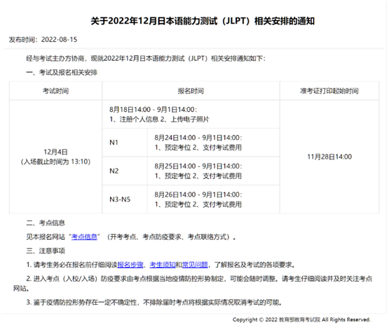 教育部考試中心官方通知:12月的日語(yǔ)能力考試于8月18日14點(diǎn)開始注冊(cè),N1考試于8月24日開始報(bào)名,N2于8月25日開始報(bào)名。