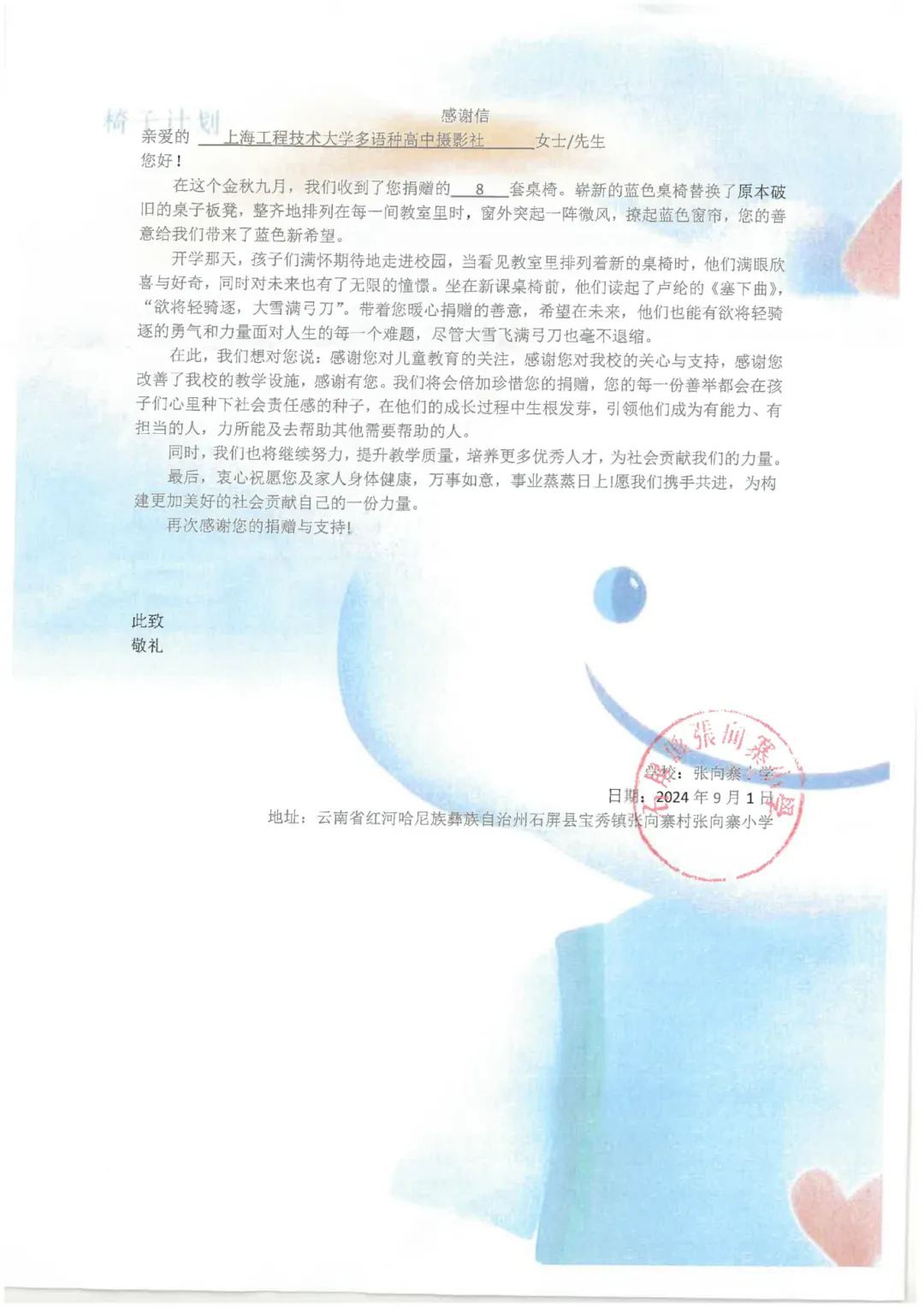 學(xué)?;顒?dòng)豐富。不僅會(huì)組織孩子們外出活動(dòng),而且還可以參加學(xué)校的各種社團(tuán)。學(xué)校有影視鑒賞社、恒景攝影剪輯社、TVB動(dòng)漫社、青乒社、音樂社、話劇社和桌游社等。我家兒子參加的是恒景攝影剪輯社。自從參加了這個(gè)社團(tuán),兒子喜歡上了攝影,還學(xué)習(xí)了一些攝影的技能。他所在的社團(tuán)還被評(píng)為學(xué)校優(yōu)秀社團(tuán)。學(xué)校還獎(jiǎng)勵(lì)了社團(tuán)的孩子們800元現(xiàn)金。社團(tuán)的孩子們拿到這筆錢并沒有自己花,而是給云南山區(qū)里的弟弟妹妹們買了學(xué)習(xí)用的桌椅。他們用自己微薄的力量獻(xiàn)上了自己的一點(diǎn)愛心。云南山區(qū)的這所學(xué)校還給孩子們寄來了表揚(yáng)信。孩子們的這一善舉跟學(xué)校和老師們平時(shí)的教育是分不開的。