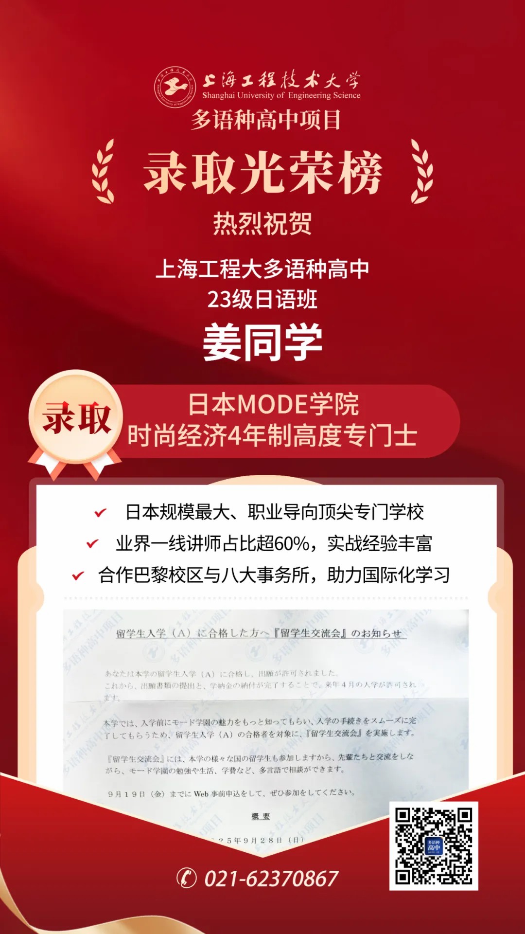 近日,上海工程技術(shù)大學(xué)多語(yǔ)種高中喜迎佳音——姜戎天同學(xué)于高三上學(xué)期成功獲得日本東京MODE學(xué)園時(shí)尚經(jīng)濟(jì)專業(yè)的錄取通知,提前一年叩開了通往國(guó)際時(shí)尚產(chǎn)業(yè)的大門。